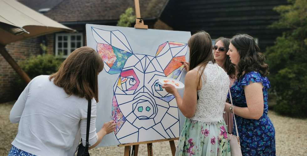 Gate St Barn is gorgeous barn venue - on site they have a regenerative, family-run farm set in the heart of The Surrey Hills. With Longhorn Cattle and Mangalitsa pigs resident the couple decided to take inspiration from this. So we explored the pig canvas idea and also randomly a giraffe. (I’m not too sure what the connection was with a giraffe but hey - anything goes!)