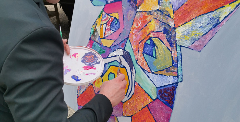 This how the canvas finished at the end of the drinks reception. There were a couple of areas not filled in so my artist Zoe and I completed those before leaving. Back at my studio the tape was removed, sections strengthened, missing areas filled in and the white lines painted in. I also gave the background another coat of paint. After showing Paige and James the canvas they requested that the area above the nose be painted a different colour as the white bleed into the lines and the pink area within the nose be defined more.